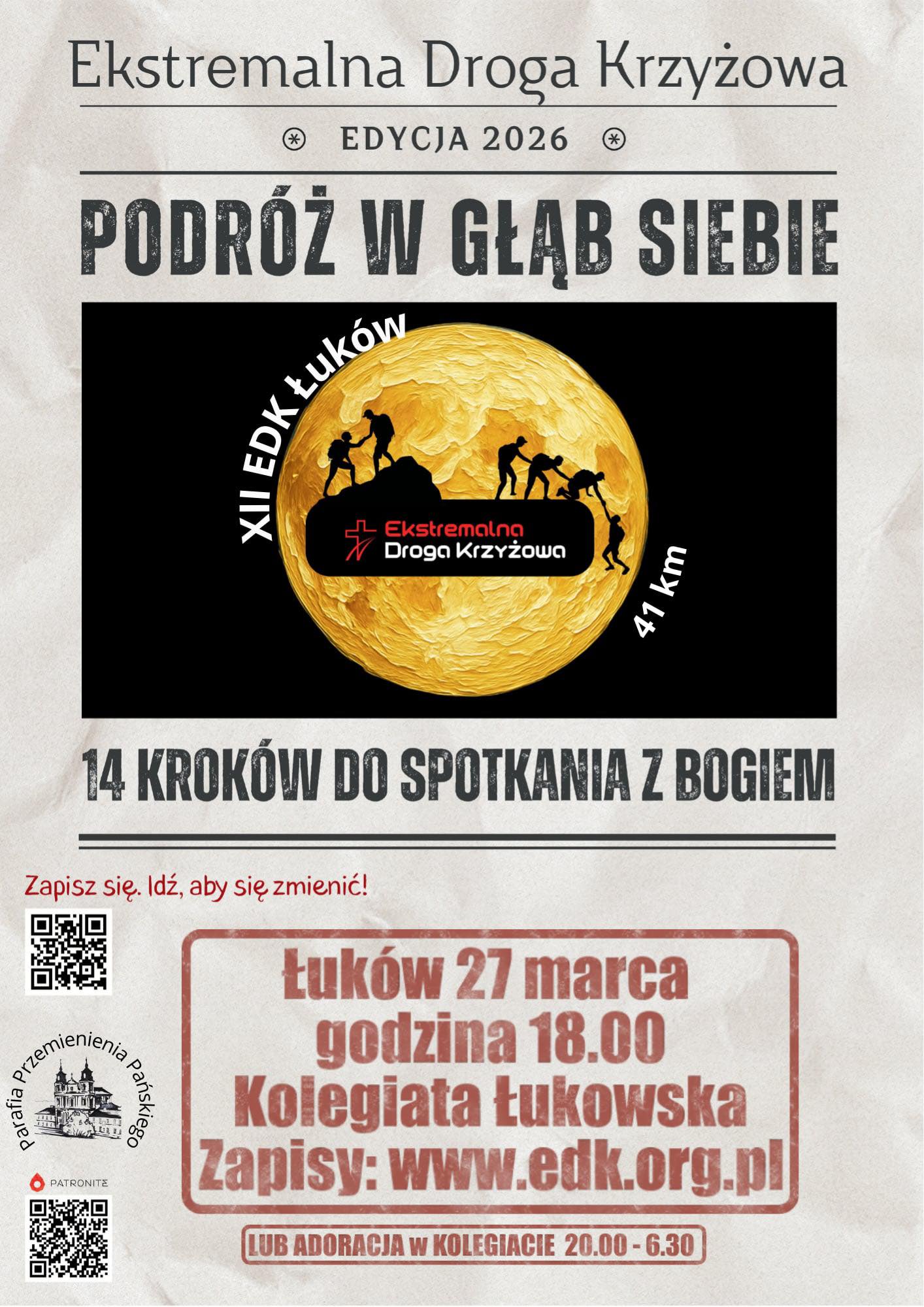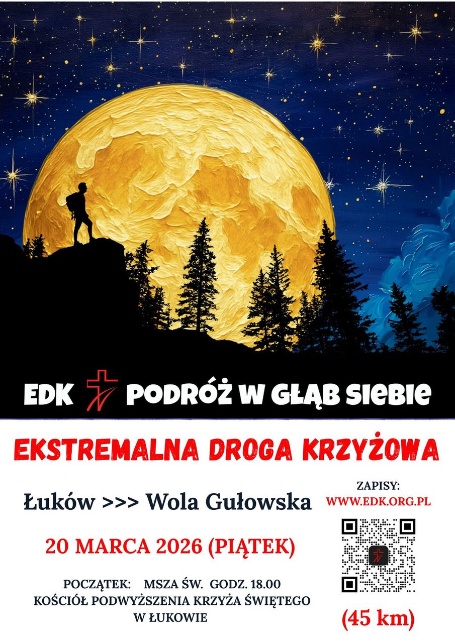 A już w kolejny piątek 20 marca odbędzie się w Łukowie Ekstremalna Droga Krzyżowa, której uczestnicy będą przemierzać trasę z parafii Podwyższenia Krzyża Świętego do Sanktuarium w Woli Gułowskiej. Natomiast w piątek, 27 marca Ekstremalna Droga Krzyżowa wyruszy z parafii Przemienienia Pańskiego.