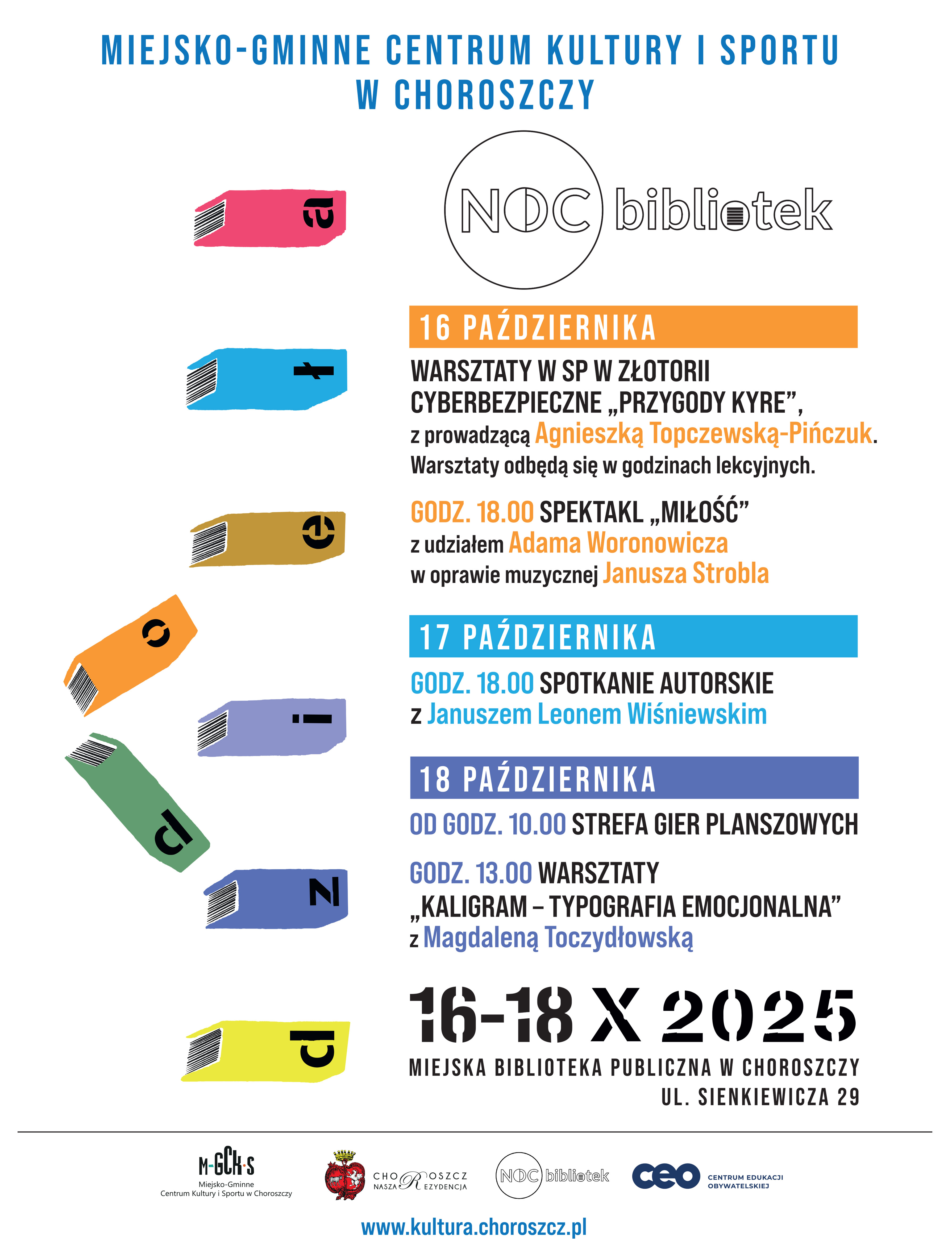 Na zakończenie Nocy Bibliotek przygotowano atrakcje dla tych, którzy lubią twórcze działania i dobrą zabawę. Podczas warsztatów „Kaligramy- typografia emocjonalna” z Magdaleną Toczydłowską – uczestnicy połączą poezję z plastyką, tworząc słowne obrazy i odkrywając nowe sposoby ekspresji. W bibliotece będzie też można skorzystać ze strefy gier planszowych. Wydarzenie skierowane jest zarówno do początkujących, jak i doświadczonych graczy. Można przyjść samemu, z przyjaciółmi albo całą rodziną i zapoznać się z grami, które niebawem będą dostępne również w opcji wypożyczenia.