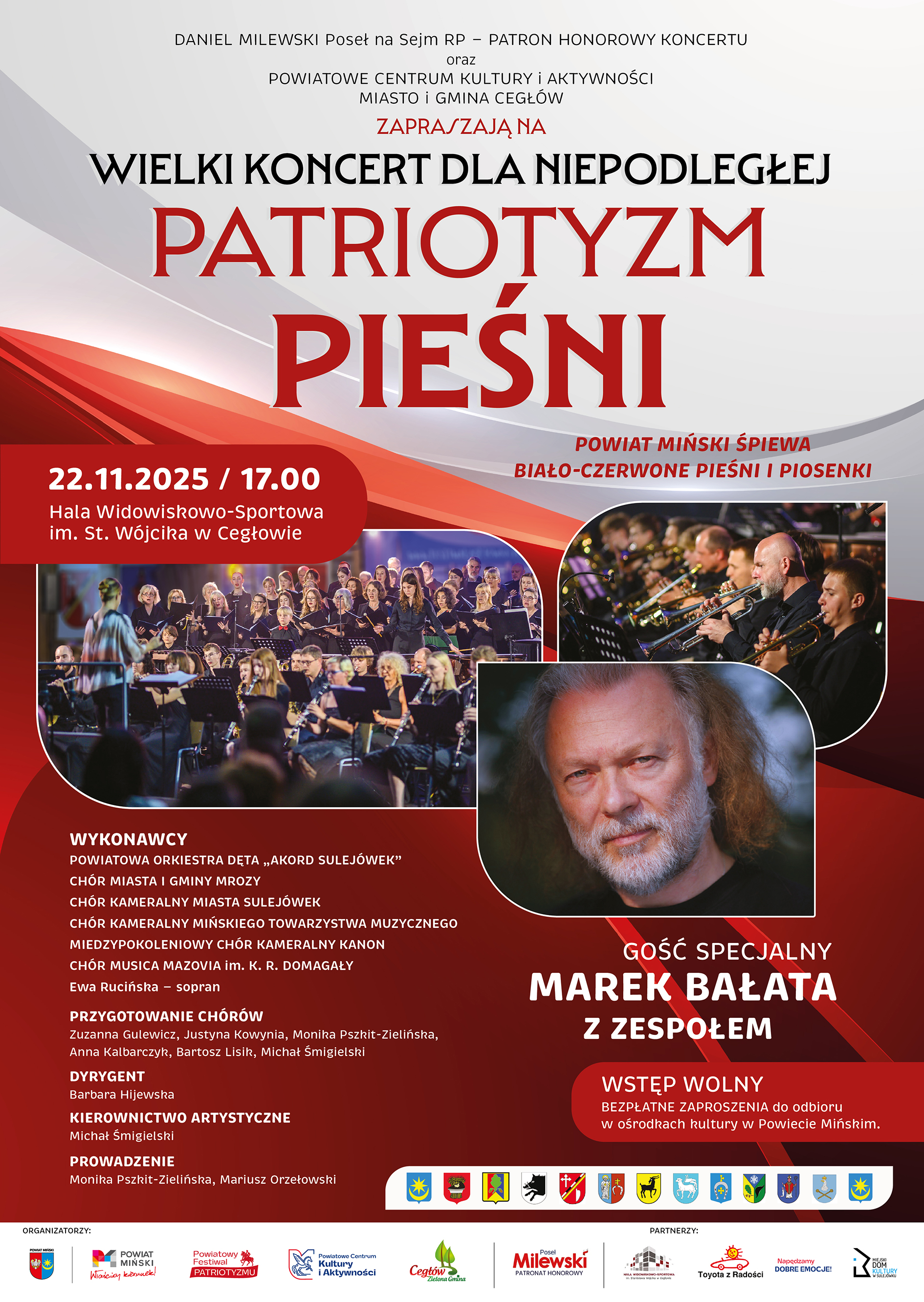 Powiatowe Centrum Kultury i Aktywności wraz z Miastem i Gminą Cegłów zapraszają mieszkańców regionu na finał Powiatowego Festiwalu Patriotyzmu. Kulminacyjnym wydarzeniem będzie Wielki Koncert dla Niepodległej „Patriotyzm Pieśni”, który odbędzie się 22 listopada o godz. 17:00 w Hali Widowiskowo-Sportowej im. Stanisława Wójcika w Cegłowie. Gościem specjalnym będzie Marek Bałata z zespołem