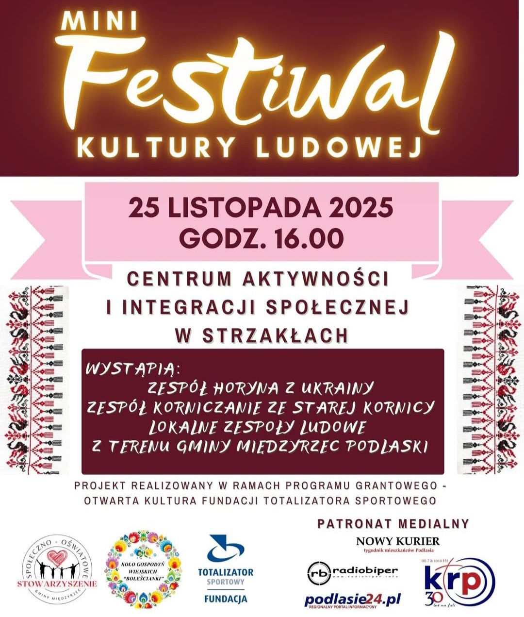 Centrum Aktywności i Integracji Społecznej w Strzakłach zaprasza na Mini Festiwal Kultury Ludowej, który odbędzie się 25 listopada o godzinie 16:00. Będzie to okazja do spotkania z bogactwem muzyki i tańca ludowego z Polski i Ukrainy.