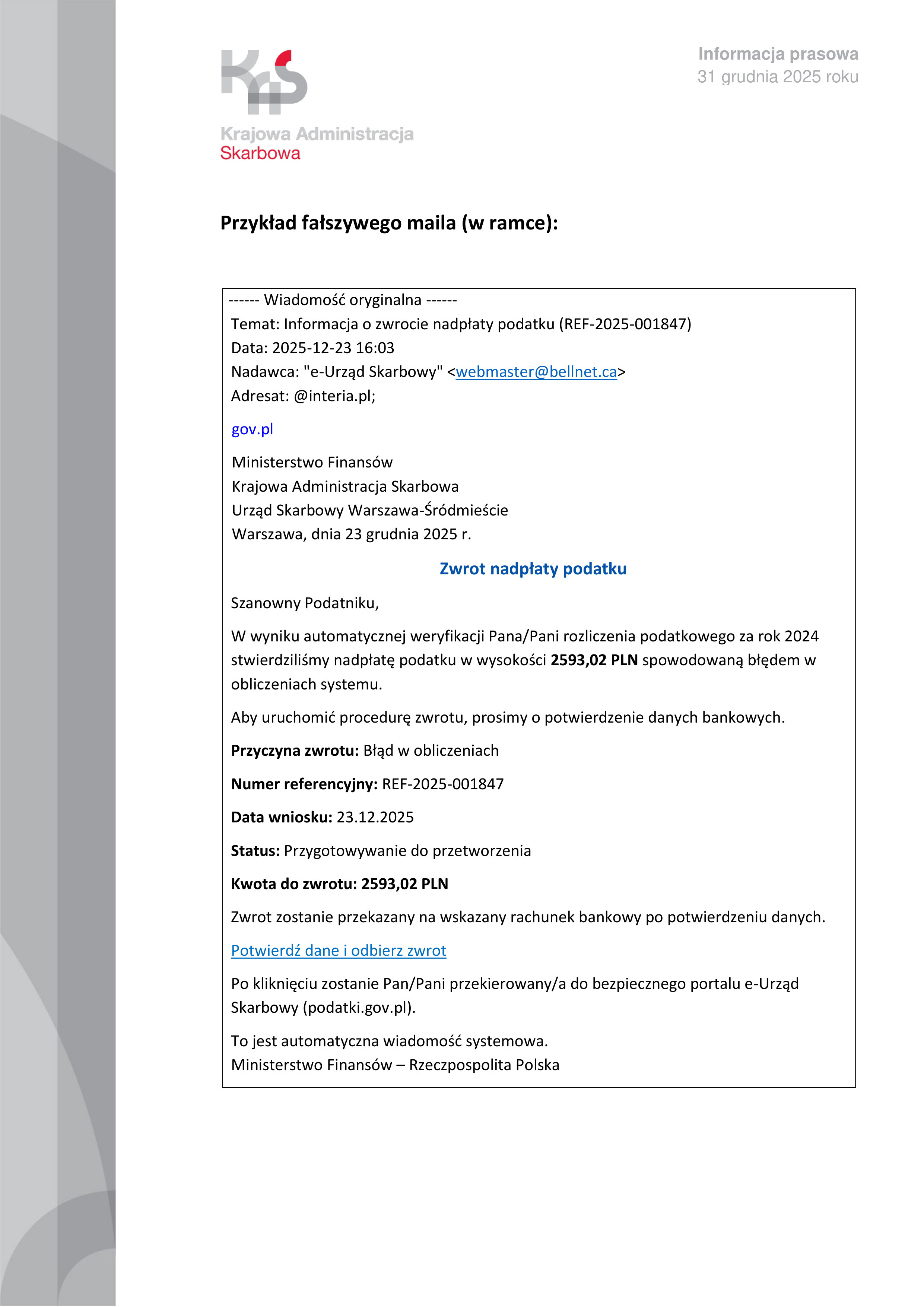 Ministerstwo Finansów oraz Krajowa Administracja Skarbowa ostrzegają przed oszustami, którzy podszywają się pod instytucje skarbowe i rozsyłają fałszywe wiadomości e-mail dotyczące rzekomego zwrotu nadpłaty podatku PIT. Celem tych działań jest wyłudzenie danych osobowych lub środków finansowych podatników.