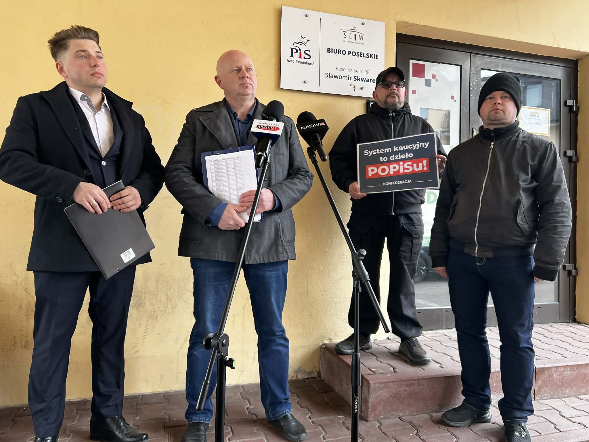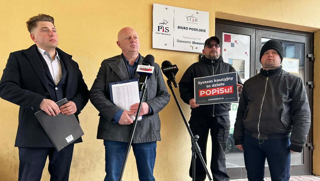 W czwartek, 9 kwietnia w Łukowie odbyła się konferencja prasowa zorganizowana przez przedstawicieli Nowej Nadziei i Ruchu Narodowego. Była jedną z wielu, jakie odbywały się w całym kraju. Na każdym takim spotkaniu głównym tematem była krytyka obowiązującego od niedawna systemu kaucyjnego. W Łukowie członkowie obu partii wchodzących w skład koalicji Konfederacja Wolność i Niepodległość, zorganizowali konferencję przed wejściem do biura posła PiS Sławomira Skwarka.Miejsce wybrano nie przypadkowo. Jak mówili podczas konferencji przedstawiciele Nowej Nadziei, Hubert Bogacz, szef łukowskich struktur oraz Adrian Ostrowski, sekretarz łukowskiego oddziału partii, to właśnie PiS wspólnie z PO odpowiadają za wprowadzenie systemu, który generuje koszty, a z klientów robi „śmieciarzy”:
