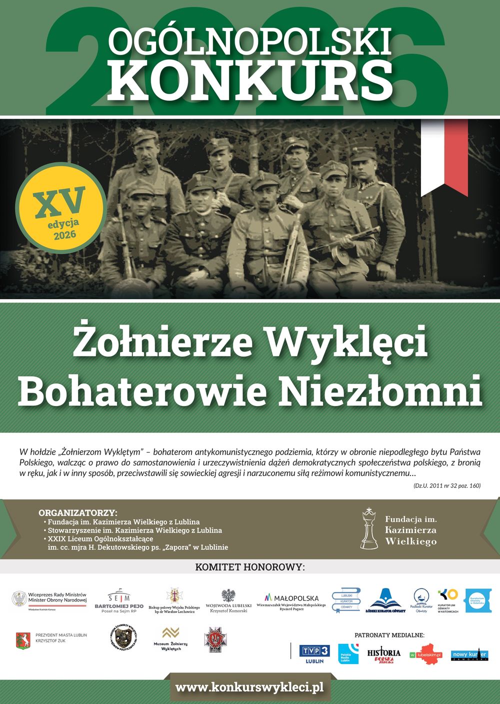 Ruszyła XV edycja Ogólnopolskiego Konkursu „Żołnierze Wyklęci – Bohaterowie Niezłomni". Termin nadsyłania prac konkursowych upływa 14 kwietnia. Organizatorem konkursu jest Fundacja im. Kazimierza Wielkiego.